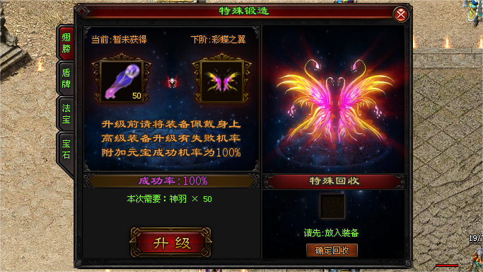 - 特殊锻造系统:翅膀、盾牌、法宝、宝石四类装备可独立升级。高阶装备消耗神羽、陨石、精元与元宝材料,可追加保证强化成功。