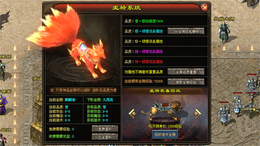 - 坐骑等级越高,附加属性越强,神级后可洗练品质。