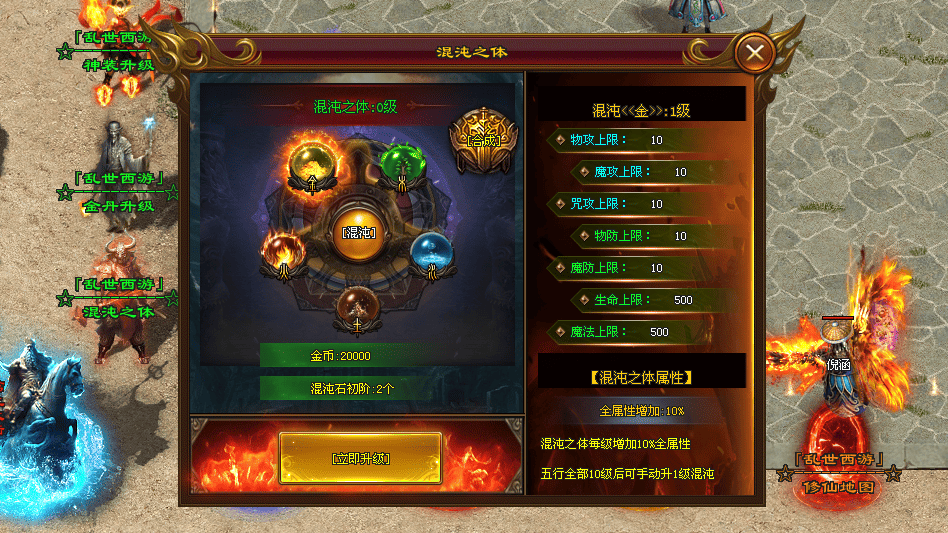 - 混沌之体:在第一大陆开放,通过混沌神诀、混沌石与金币升级,能带来五行属性和百分比加成。最高可达9级,是贯穿全程的重要成长目标。