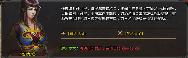 - 迷魂塔:每周日晚开启,99层随机跳转挑战,根据通关排名发放丰厚奖励,前3名可获得高额红包。