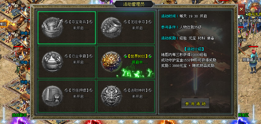 - 世界BOSS:每日22:10刷新,爆率极高,掉落全服所有装备,是顶级玩家必争的资源点。