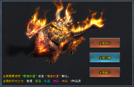 丰富的坐骑系统为玩家提供了成长与外观的双重乐趣。玩家可通过坐骑宝盒或橙色坐骑宝盒获取各类稀有坐骑,终极橙色坐骑还可融合属性,实现更强战力提升: