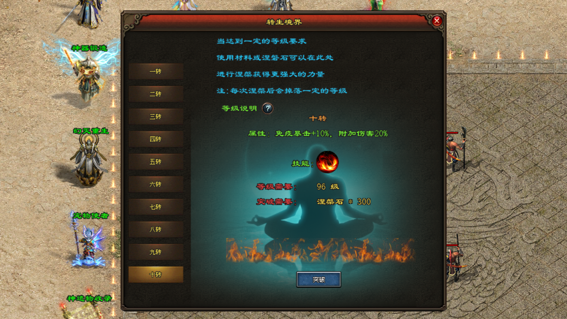 等级达到69级即可在幻灭重生NPC处开启“转生境界”,共分十转。每次转生需材料达标并重塑等级,获得更强属性与专属技能: