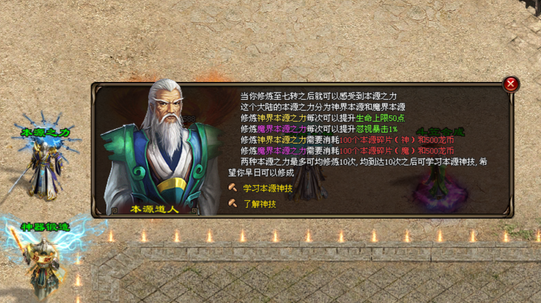 核心机制为“本源之力”系统,修炼者可选择神界或魔界两条路径: