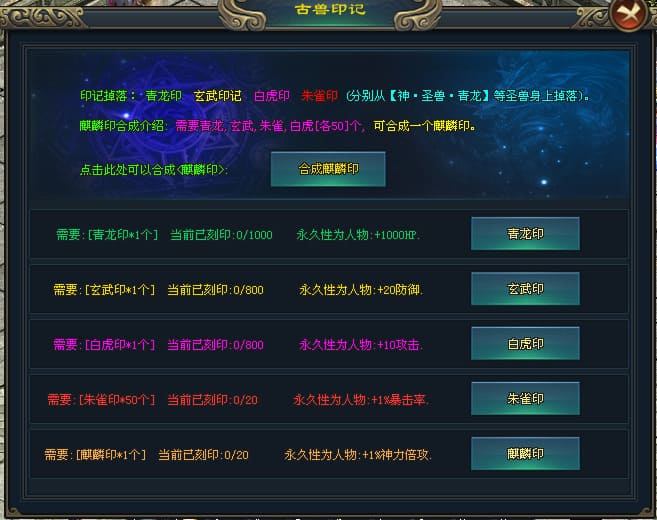 - 古兽印记:击杀圣兽可获得印记,激活后增加多种属性。玩家可自由选择,打造差异化成长路线。